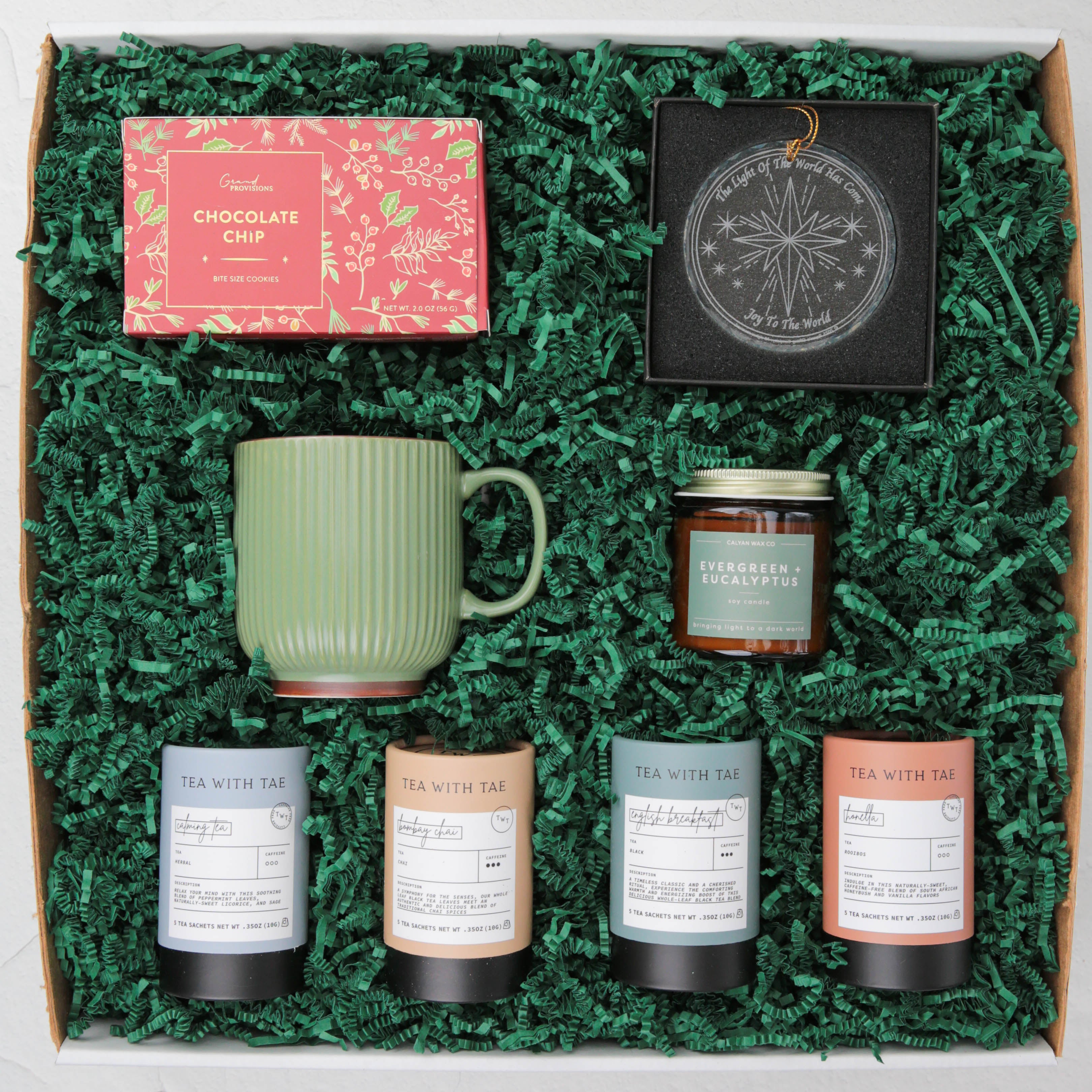 Spread warmth and joy this season with our Tea-Lightful Tidings gift! This delightful collection includes an Evergreen + Eucalyptus candle to fill the air with seasonal magic, a sparkling crystal snowflake ornament, a chic Green mug paired with a variety of quality teas, and some delicious Christmas cookies. This gift is everything they need to sip, savor, and celebrate the most wonderful time of the year.